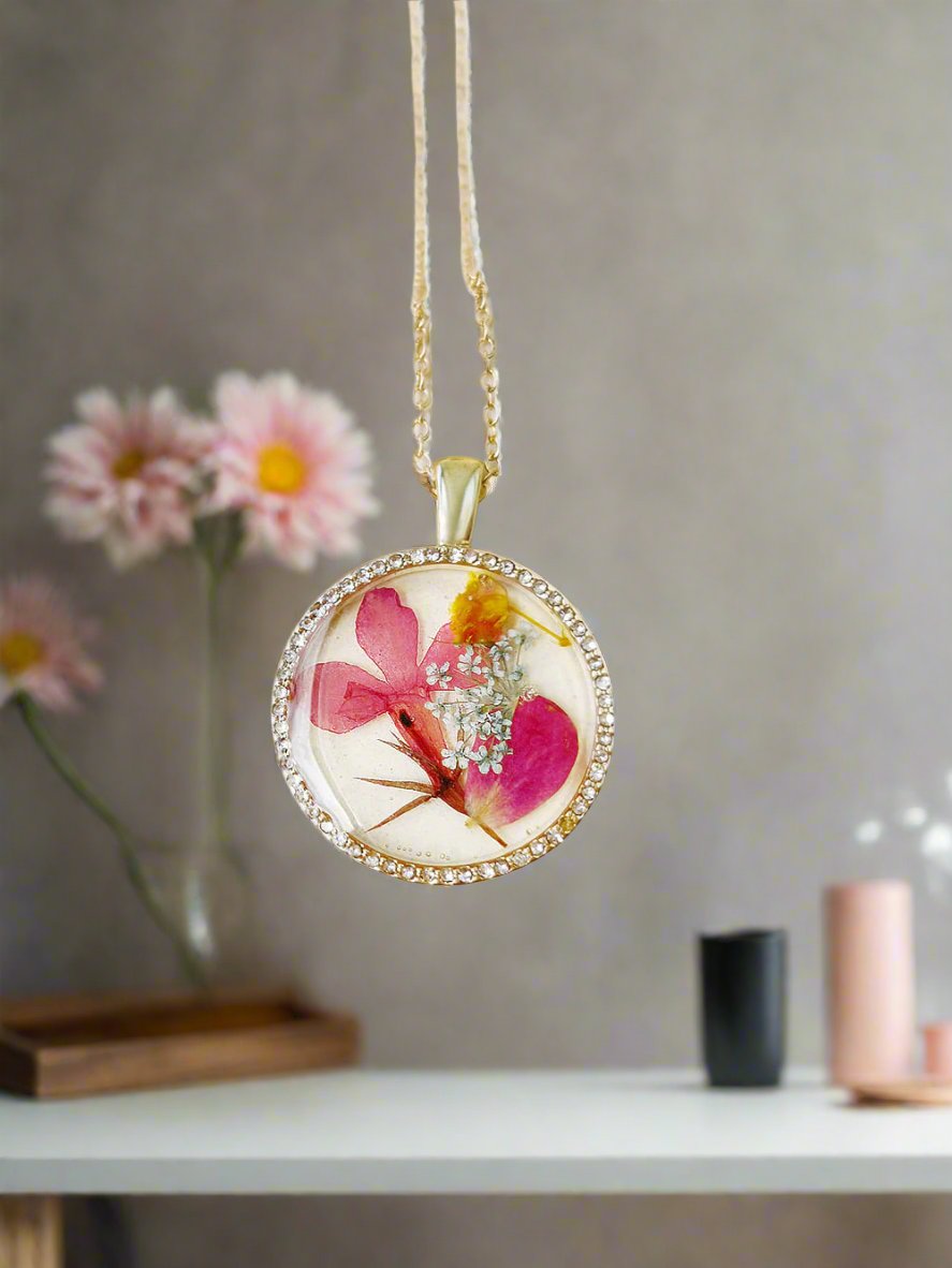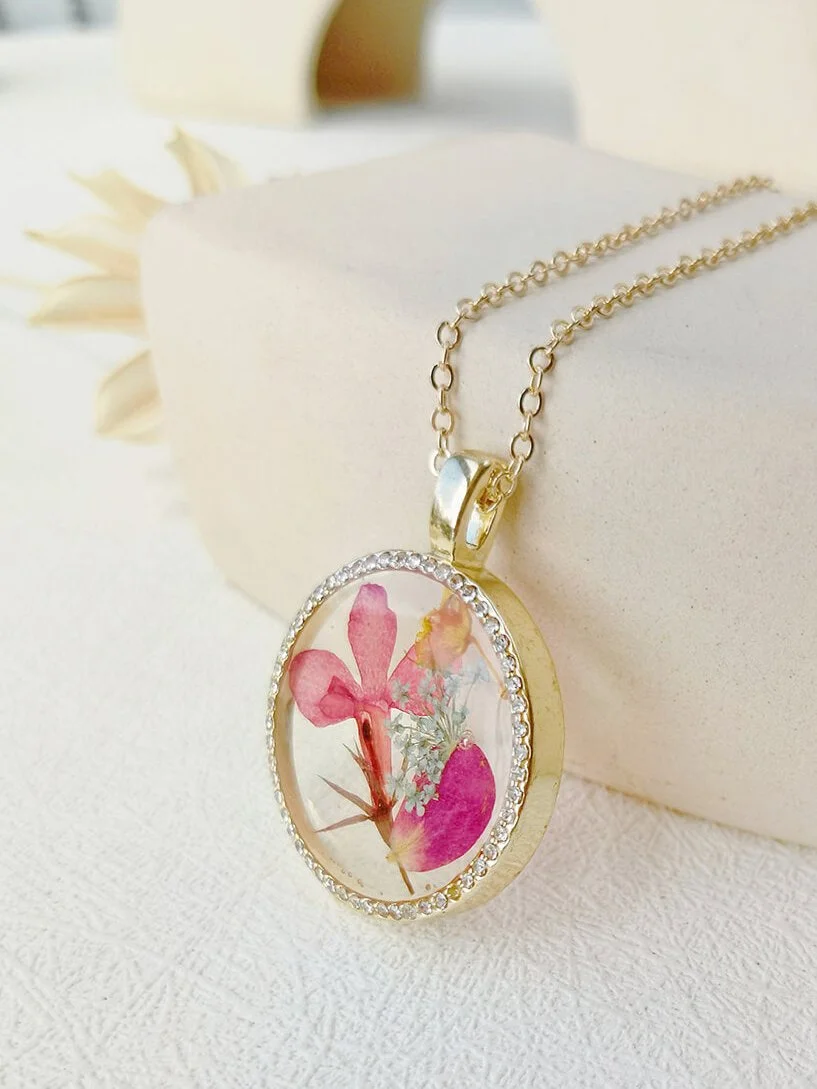 This quirky necklace features a dancing orchid flower resin pendant that sparkles with round crystals. Bring some playful charm to any outfit with this unique piece. Perfect for those who don't take themselves too seriously (but still want to look fabulous!)