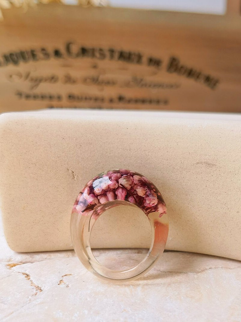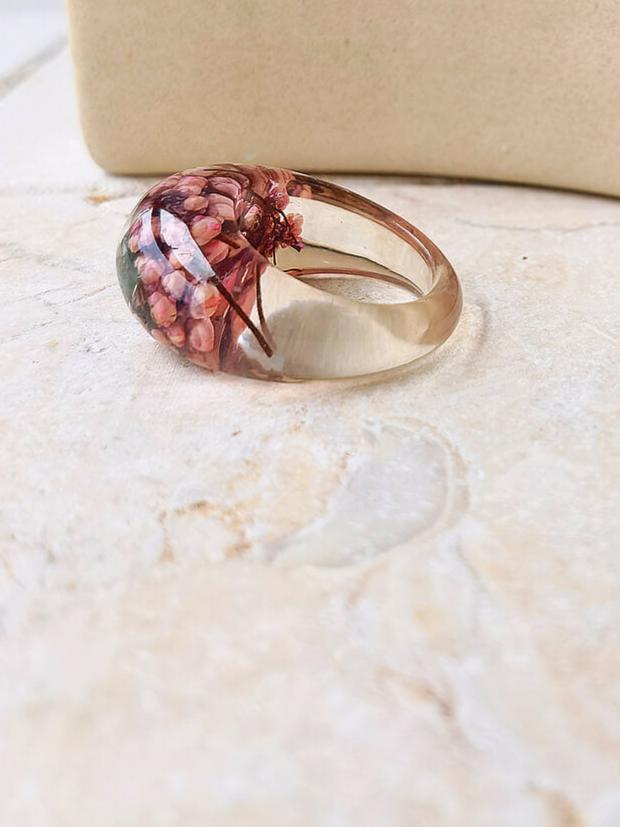 This unique ring features real dried flowers encased in resin for a one-of-a-kind statement piece. Handmade with care, this ring adds a touch of nature to any outfit.