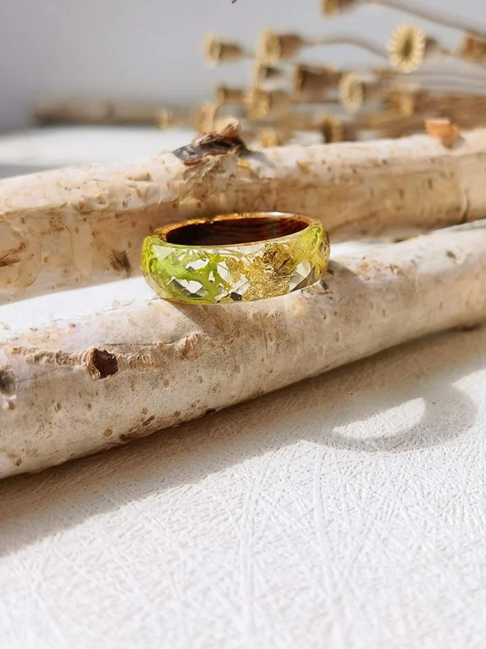 Embrace adventure with our Handmade Dried Flower Inlaid Resin Ring - Gold Foil Seaweed. This unique piece features real dried flowers and shimmering gold foil, making each ring one-of-a-kind. Wear it as a reminder to take risks and seize the moment!