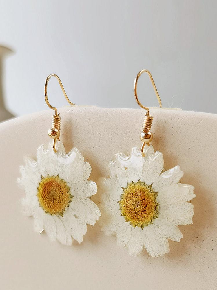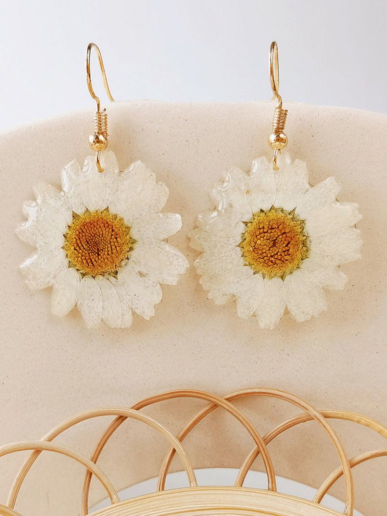 Celebrate the beauty of nature with our Pressed Flower Drop Earrings. Each piece features a delicate daisy, encapsulated in resin for a unique and timeless look. The perfect accessory for a sophisticated and exclusive style. Elevate any outfit with these elegant and tasteful earrings.