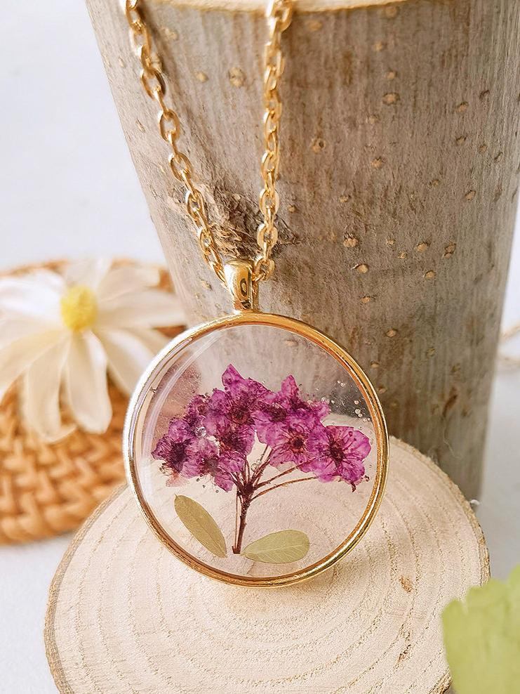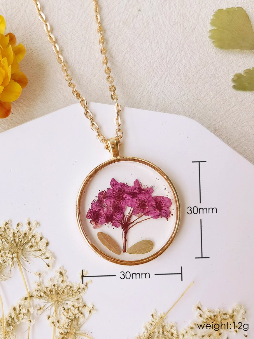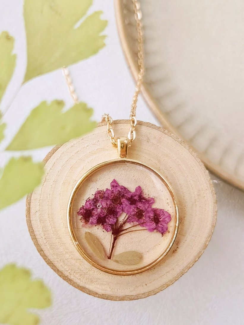This round necklace features a beautiful pressed Gypsophila flower encased in resin. Crafted with natural materials, this botanical pendant adds a touch of delicate beauty to any outfit. Bring a piece of nature with you wherever you go with this unique and elegant necklace.