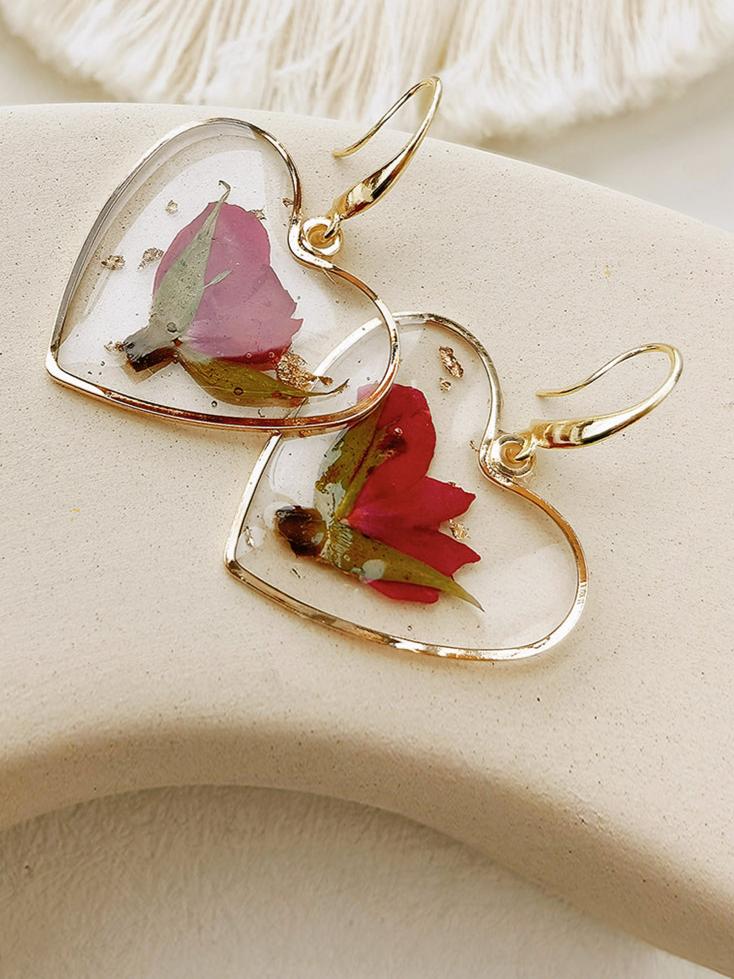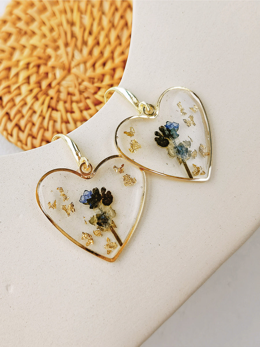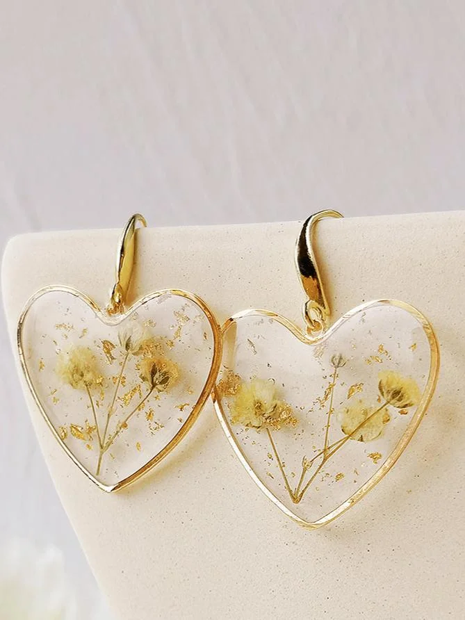 These Pressed Flower Earrings are delicately crafted with a resin heart and real dried flowers, creating a unique and nature-inspired accessory. The lightweight design makes it comfortable to wear all day long. Elevate any outfit with these beautifully preserved earrings.