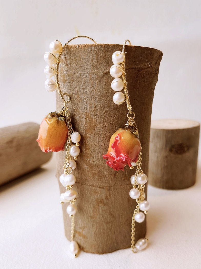 These elegant earrings feature real pressed flowers, encased in delicate pearls. Experience the beauty and uniqueness of dried rose petals in a stunning piece of jewelry. With these earrings, you can make a statement and embrace nature's beauty at the same time.